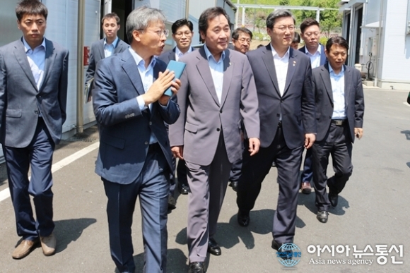 | 이낙연 국무총리가 23일 세종시 전의 제2산업단지에 있는 소재전문 우수 중소기업 (주)레이크머티리얼즈를 방문해 기업현황을 보고 받고 주영섭 중소기업청장(오른쪽)과 김진동 대표이사(왼쪽)로부터 설명을 들으며 생산시설을 둘러보고 있다./아시아뉴스통신=홍근진기자 |