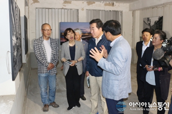 | 이낙연 국무총리가 24일 세종시 조치원읍 평리 구 정수장터를 찾아 ‘청춘조치원 프로젝트’ 지역 활력사업 추진현황을 보고 받고 시민주도로 진행되는 이 사업의 성공을 기원하며 관계자들을 격려했다. 폐쇄된 정수장을 되살리기 위해 사진 전시장으로 개조해 놓은 현장에서 이춘희 시장의 설명을 듣고 있는 이 총리./아시아뉴스통신=홍근진 기자 |