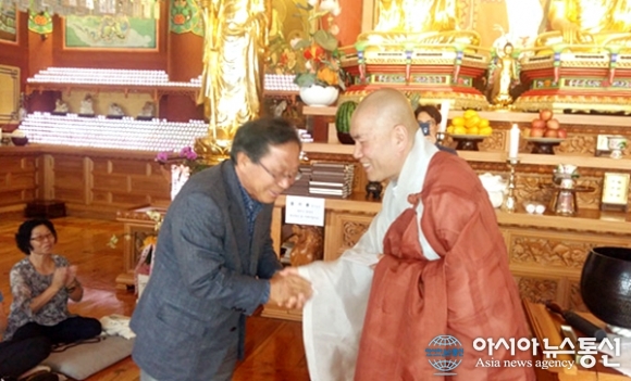 | 24일 오영철 세종시 불교신도 연합회장(일미농수산 회장)이 세종시 축제로 발돋움하고 있는 영평사 구절초 축제에 쓰일 구절초를 이식하고 관리하는데 보태달라고 환성 주지 스님에게 발전기금 1000만원을 전달했다. 매년 10월 초에 열리는 영평사 구절초 축제는 올해로 18회째를 맞고 있으며 장군산 일대에 흐드러지게 피는 구절초를 보기 위해 전국에서 많은 관광객이 찾고 있다.(사진제공=세종시기자협의회) |