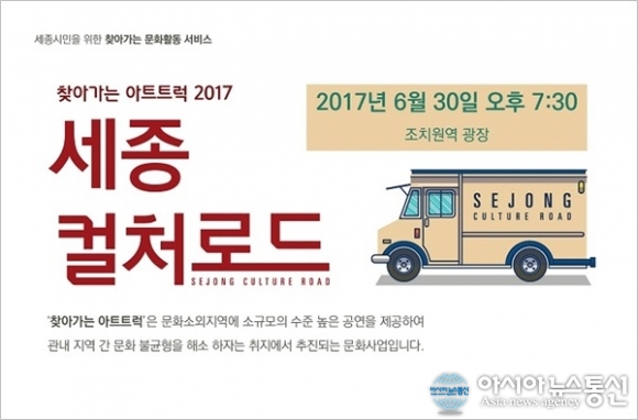 세종시문화재단(대표이사 인병택)이 오는 30일 오후 7시 반부터 찾아가는 아트트럭 ‘2017 세종 컬처로드’를 조치원역 광장에서 개최한다.