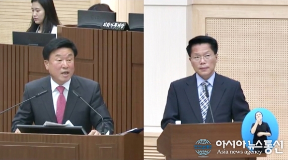| 27일 세종시의회 정례회에서 김정봉 의원이 한경호 행정부시장(오른쪽)에게 긴급 현안질문을 하고 있다.(사진출처=세종시의회) |