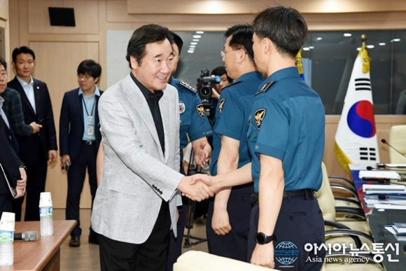 | 이낙연 국무총리가 문재인 대통령이 해외 순방 중인 8일 국내치안에 소홀함이 없도록 챙기기 위해 경찰청 치안상황실을 방문해 보고 받고, 근무자들을 격려했다. 이 총리는 “폭우 폭염 안전사고와 북한이나 테러집단 도발에 대비하고, 공권력을 엄정하게 집행하면서도 인권침해가 없도록 경찰개혁을 충실히 해달라”고 당부했다.(사진출처=SNS) |
