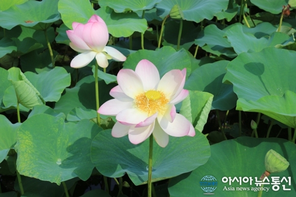 | 8일 세종시 조치원 연꽃공원 일원에서 제2회 조치원 연꽃축제가 밸리페스티벌, 버스킹, 콘서트, 체험부스 및 플리마켓존, 연꽃 셀카 및 디카 콘테스트, 주민자치 작품 전시 등의 프로그램으로 운영됐다. 오전에 비가 온 뒤 햇살이 비추자 뽀얀 미소를 짓는 연꽃./아시아뉴스통신=홍근진 기자 |