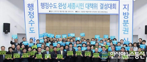 | 세종시 행정수도 완성 대책위 대국민 홍보에 나선다. 사진은 지난 3월 결성대회를 하고 있는 대책위 모습./아시아뉴스통신DB |