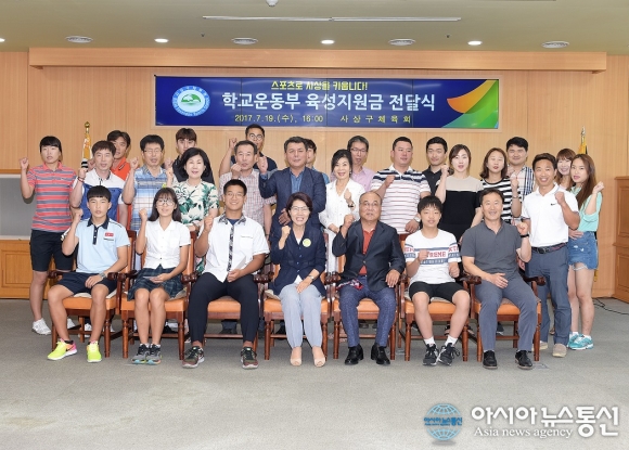 | 지난 19일 부산 사상구(구청장 송숙희)는 ‘2017년 학교운동부 육성지원’ 사업으로 관내 12개 학교를 선정하고 지원금을 전달했다.(사진제공=사상구청) |