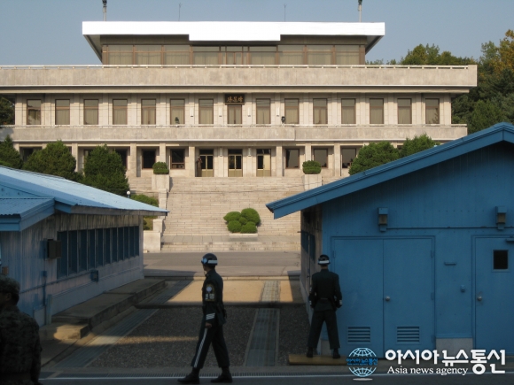 | 군사분계선에 위치한 판문점 공동경비구역(JSA)에서 한국의 경비대원들이 경계근무를 서고 있는 가운데 맞은 편 북한의 판문각에서 경비병 한 명이 망원경을 들고 남측을 지켜보고 있다./아시아뉴스통신DB |