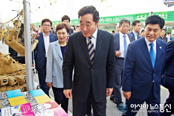 | 이낙연 국무총리가 22일 세종시 호수공원에서 열린 행복도시 착공 10주년, 세종시 출범 5주년 기념식에 참석해 전시부스를 둘러보고 있다.(사진제공=세종시기자협의회) |