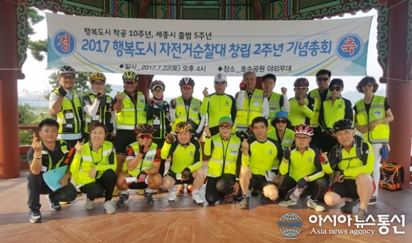 | 세종경찰서(김철문 서장)와 협력치안을 실천하고 있는 세종시 신도시 자전거 순찰대가 지난 22일 세종호수공원 팔각정에서 정기총회를 갖고 2기 대장에 윤명중씨를(55. 자영업) 선임하고 기념사진을 찍고 있다. 이날 총회에서는 한솔소담지대장에 최명진(46), 도담지대장에 김현석(56)씨가 각각 선출됐다.(사진제공=세종경찰서) |