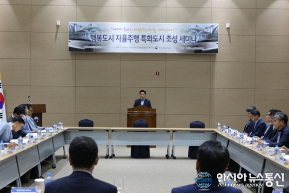| 27일 세종시에 있는 정부컨벤션센터에서 행복청과 세종시가 공동 주최하고 한국교통연구원이 주관해 20여명의 국내 최고 전문가와 30여개의 자동차 부품 제작 관련업체가 참가한 가운데 첨단 미래교통을 선도하는 자율주행 특화도시 세미나가 열려 한경호 세종시 행정부시장이 환영사를 하고 있다./아시아뉴스통신=홍근진 기자 |