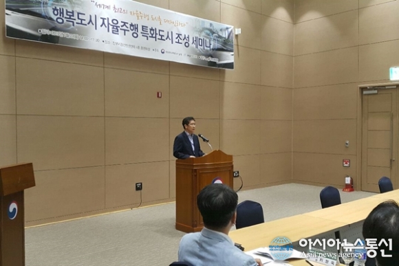 | 27일 세종시에 있는 정부컨벤션센터에서 행복청과 세종시가 공동 주최하고 한국교통연구원이 주관해 20여명의 국내 최고 전문가와 30여개의 자동차 부품 제작 관련업체가 참가한 가운데 첨단 미래교통을 선도하는 자율주행 특화도시 세미나가 열려 안시권 행복청 차장이 환영사를 하고 있다.(사진제공=행복도시건설청) |