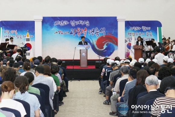 | 15일 제72주년 광복절을 맞아 세종시 정부컨벤션센터에서 광복회원과 시민 학생 등 400여명이 참석한 가운데 열린 경축식에서 이춘희 세종시장이 경축사를 하고 있다. 이 시장은 “제72주년 광복절과 세종시 착공 10주년, 출범 5주년을 맞아 시민과 함께 행정수도의 꿈을 실현하겠다”고 말했다./아시아뉴스통신=홍근진 기자 |
