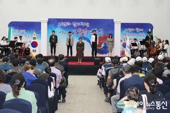 | 15일 제72주년 광복절을 맞아 세종시 정부컨벤션센터에서 광복회원과 시민 학생 등 400여명이 참석한 가운데 경축식이 열렸다. 사진은 예술창작소 이음의 ‘광복군 온몸으로 대한독립을 불사르다’ 경축공연이 펼쳐지고 있다./아시아뉴스통신=홍근진 기자 |
