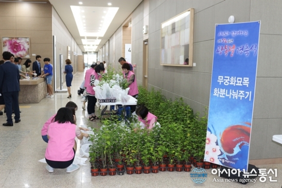 | 15일 정부세종컨벤션센터에서 열린 ‘제27회 나라꽃 무궁화 세종축제’행사장에서 세종시가 광복절 경축식에 참석한 시민들에게 무궁화 묘목을 나눠주고 있다./아시아뉴스통신=홍근진 기자 |