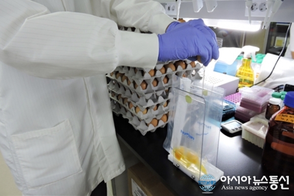 | 세종시 가축위생연구소가 16일 관내 산란계 농장의 계란 농약성분에 대한 검사를 하고 있다.(사진제공=세종시청) |