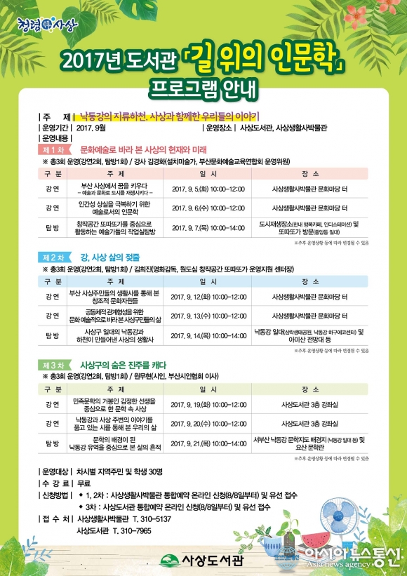 1차(9월 5일~7일), 2차(9월 12일~14일)는 사상 생활사 박물관 문화마당에서, 3차(9월 19일~20일)는 사상도서관 강좌실에서 강연 할 예정이며 누구나 무료로 참여가 가능하다.