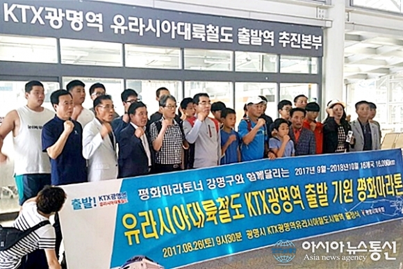 | 26일 KTX 광명역에서 양기대 광명시장(앞줄 왼쪽 세번째)과 관계자 등이 참석한 가운데 다음달 1일 네델란드 헤이그에서 출발해 1년 2개월 동안 16개국 1만 6000km의 유라시아대륙 횡단 마라톤에 나서는 강명구씨(60.가운데 모자쓴 사람)의 출정식이 열렸다. KTX 광명역에는 유라시아대륙철도 출발역 추진본부가 설치돼 있다. 강 씨는 이날 정오 광화문 세종대왕 동상 앞에서 열리는 추진위 출정식에도 참석할 예정이다.(사진제공=유라시아횡단마라톤추진위) |