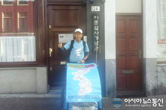 | 28일 유라시아대륙 횡단 평화마라톤에 도전하기 위해 네델란드의 헤이그 이준열사 기념관에 도착한 강명구씨. 다음달 1일 이곳을 출발해 1년 2개월 동안 1만 6000km의 장도에 오른다.(사진제공=강명구) |