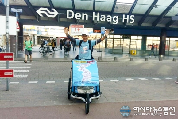 | 다음달 1일부터 네델란드 헤이그를 출발해 1년 2개월 동안 16개국 1만 6000km의 유라시아대륙 횡단 평화마라톤에 도전하는 강명구씨(60)가 28일 현지에 도착했다. 강 씨 앞에는 한반도기가 선명한 음료수 등을 싣고 달리기 위해 마련한 유모차가 보인다. 한편 송영길 의원(54.더민주당.전남 고흥)은 이 유모차로는 대륙 횡단이 어렵다며 2000만원을 자동차 구입에 보태달라고 기부했다.(사진제공=강명구) |