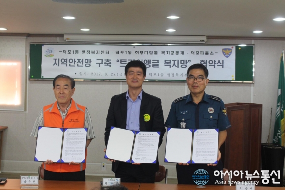 부산 사상구 덕포1동 행정복지센터(동장 최차영)는 지난 25일 덕포1동 희망디딤돌복지공동체(위원장 남우현), 덕포파출소(소장 이승재)와 트라이앵글 복지망 구축을 위한 협약식을 가졌다.