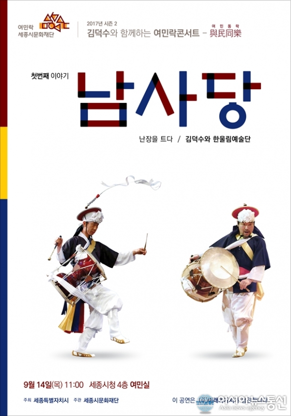 29일 세종시문화재단에 따르면 이번에 공연되는 ‘김덕수와 함께하는 여민락콘서트’는 1500년의 역사를 자랑하는 ‘남사당 놀이’로 준비했다.