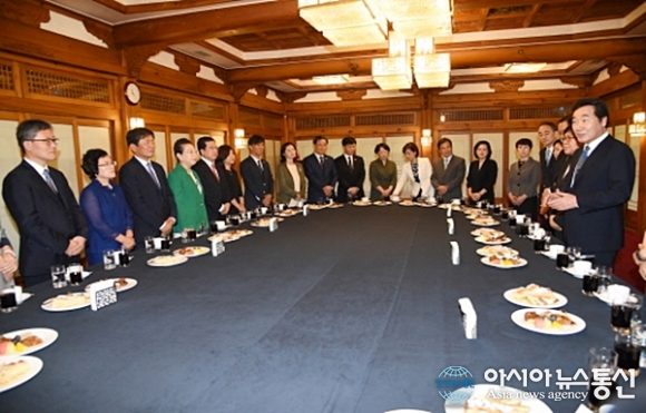 | 이낙연 국무총리가 지난 24일 삼청동 총리서울공관에서 새 정부 출범 후 임명된 차관급 공직자 16명에게 임명장을 수여하고 배우자들과 함께 환담을 나누고 있다.(사진출처=국무총리실) |