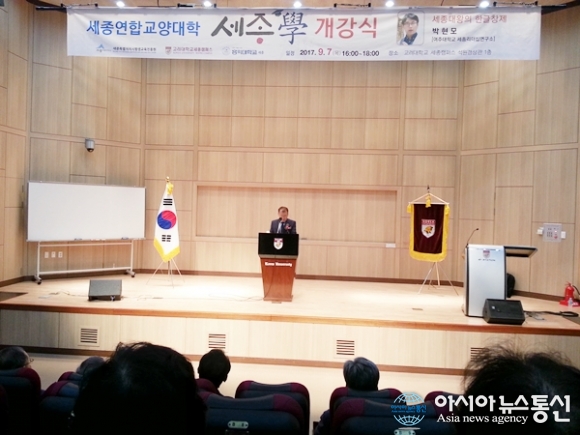 | 7일 고려대 세종캠퍼스 석원경상관에서 개강한 세종시 연합교양대학 ‘세종학’ 첫 강연을 하고 있는 박현모 여주대 세종리더십연구소장./아시아뉴스통신=홍근진 기자 |
