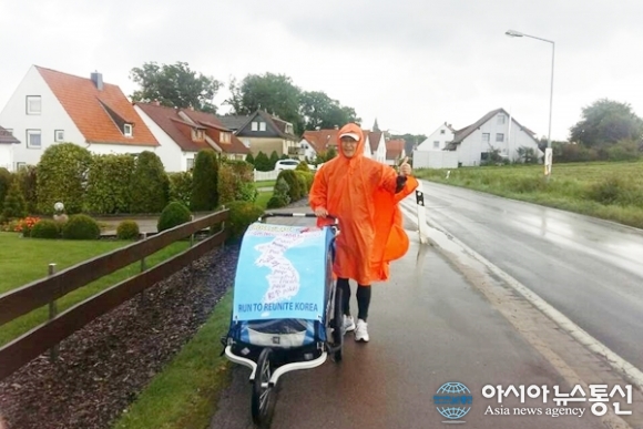 | 독일 데트몰트에서 하멜른으로 가는 길에 비가 오락가락해 우비를 입고 있는 모습.(사진=강명구) |