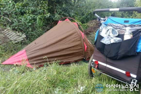 | 유럽의 숙박비가 만만치 않아 야영을 하기 위해 강가에 친 텐트와 나의 동반자 유모차.(사진=강명구) |