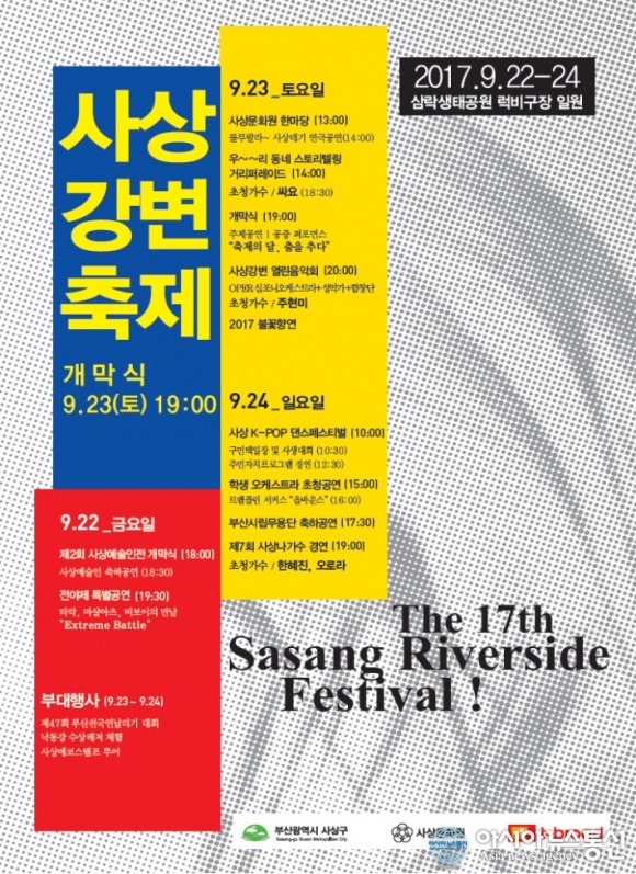 올해로 17회째를 맞으며 알찬 프로그램으로 가득 채워진 ‘2017년 사상강변축제’가 오는 22일부터 24일까지 3일간 삼락생태공원 일원에서 펼쳐진다.