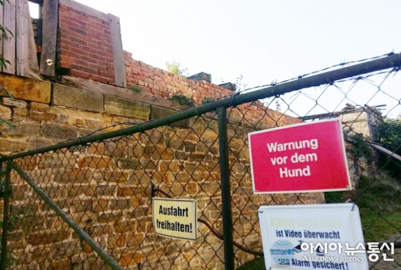 | 구 동독의 시설물로 보이는 건물 입구에 ‘주차금지! 개조심’ 등의 경고 문구가 붙어 있다.(사진=강명구) |