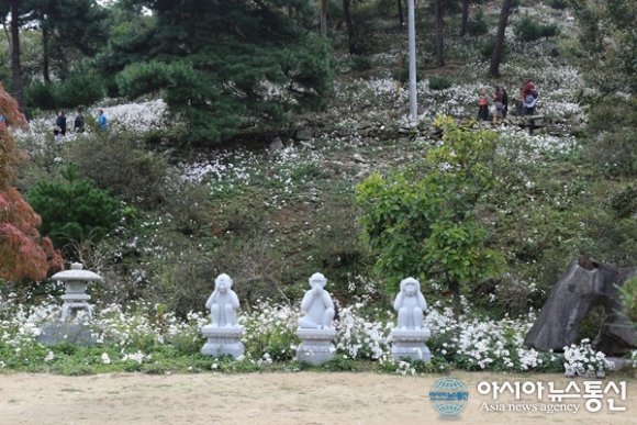 7일 구절초가 흐드러지게 핀 가운데 세종시 장군산 영평사에서 제18회 구절초 꽃축제가 개막됐다. 삼명선원 뒷 산을 활짝 핀 구절초가 하얗게 뒤덮고 있는 모습./아시아뉴스통신=홍근진 기자