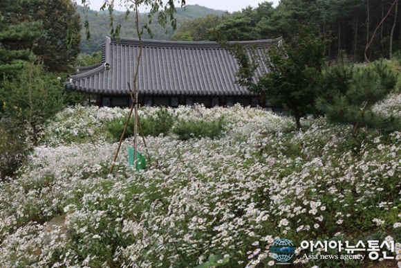 | 7일 구절초가 흐드러지게 핀 가운데 세종시 장군산 영평사에서 제18회 구절초 꽃축제가 개막됐다. 삼명선원 뒷 산을 활짝 핀 구절초가 하얗게 뒤덮고 있는 모습./아시아뉴스통신=홍근진 기자 |