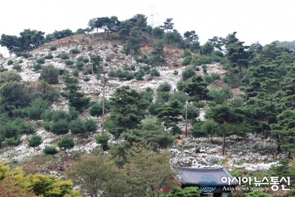 | 7일 구절초가 흐드러지게 핀 가운데 세종시 장군산 영평사에서 제18회 구절초 꽃축제가 개막됐다. 대웅전 뒷 산을 활짝 핀 구절초가 하얗게 뒤덮고 있는 모습./아시아뉴스통신=홍근진 기자 |