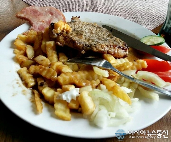 | 장거리를 달리면서 육류를 보충하는건 중요한 일이다. 비스트리지체로 가면서 먹은 식사.(사진=강명구) |