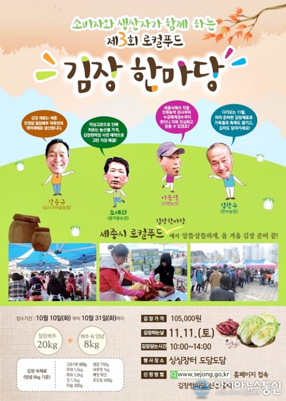 세종시는 올해로 3회째를 맞이하는 '로컬푸드 우리집 김장담그기 한마당'이 다음달 11일 오전 10시부터 오후 2시까지 도담동 싱싱장터에서 열린다고 12일 밝혔다.