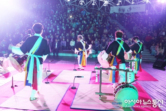 | 12일 세종시 호수공원 수상무대섬에서 열린 김덕수 사물놀이 공연 장면. 비가온 후 갑자기 추워진 날씨에도 불구하고 1000여명의 시민들이 참석해 공연을 관람했다. 이날 공연에서는 삼도의 설장고와 농악 가락이 연주됐다./아시아뉴스통신=홍근진 기자 |