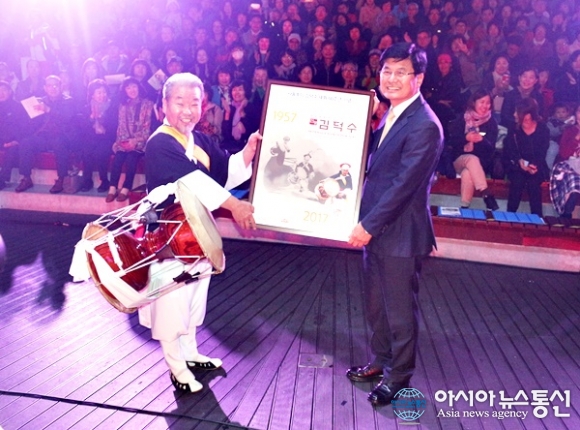 | 12일 세종시 호수공원 수상무대섬에서 열린 김덕수 사물놀이 공연에 앞서 지난 1957년 5살때 조치원 난장에서 ‘새미’역할로 데뷔해 올해로 데뷔 60주년을 맞이했다는 김덕수씨에게 이춘희 시장이 기념액자를 전달하고 있다./아시아뉴스통신=홍근진 기자 |