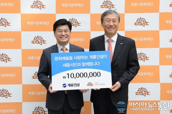| 13일 한승구 계룡건설 회장(오른쪽)이 세종시청에서 이춘희 세종시문화재단 이사장에게 문화예술지원금 1000만원을 후원했다. 후원금은 문화메세나를 통해 여민락콘서트 등의 공연을 위해 쓰일 예정이다.(사진제공=세종시문화재단) |