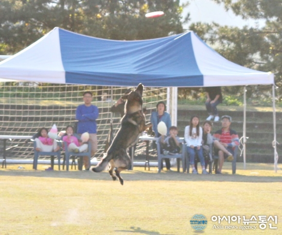 | 21일 세종시 교과서 박물관에서 제3회 반려동물 문화축제가 열려 프로그램 중 하나인 스카이하운즈 아시아 예선, 플라잉 디스크 대회에 출전한 한 반려견이 묘기를 보이고 있다./아시아뉴스통신=홍근진 기자 |