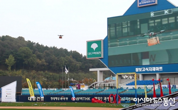 | 경북지방우정청이 29일 대구삼성라이온즈파크에서 드론 우체국 택배 배송 시연을 하고 있다.(사진제공=경북우정청) |