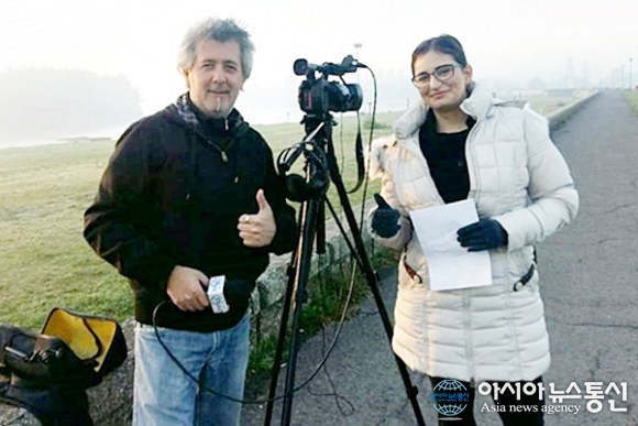 | 세르비아 호텔 식당에서 인터뷰를 요청해 응해준 베체이 방송 카메라맨과 여자 기자.(사진=강명구) |