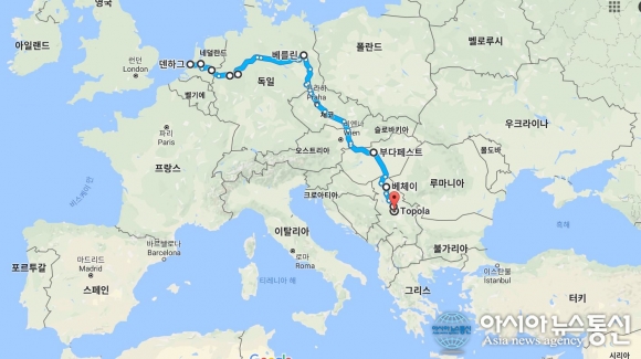| 강명구씨가 지난 9월 1일 네델란드 헤이그를 출발해 2달 동안 달린 2300여km 경로지도.(사진=김미경) |
