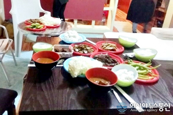 마침 묵는 호텔은 주방시설이 갖추어진 호텔이었고 금방 김이 모락모락 나는 밥이 되었고 상에는 고추장찌개, 배춧속, 소고기 장조림, 고추, 오이지 등 한상 잘 자려졌다.