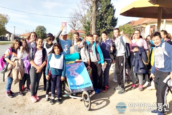 | 하굣길 버스정거장에 차를 기다리던 세르비아 아이들이 몰려와 기념사진을 찍고 있다.(사진=김나라) |