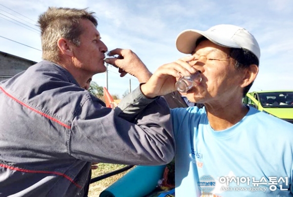| 또뽈라에서 크라꾸예바츠로 가는 길목에 어느 작업장에서 라키야로 러브샷 하는 장면.(사진=김나라) |