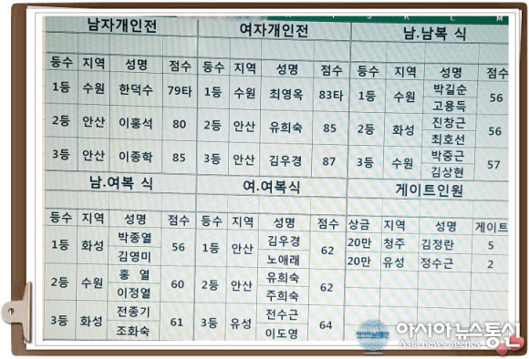 | 지난 4일 경기 안산시에서 제1회 안산시장배 전국 우드볼대회가 열린 가운데 선수들의 종합 성적 점수표.(사진제공=안산우드볼협회) |