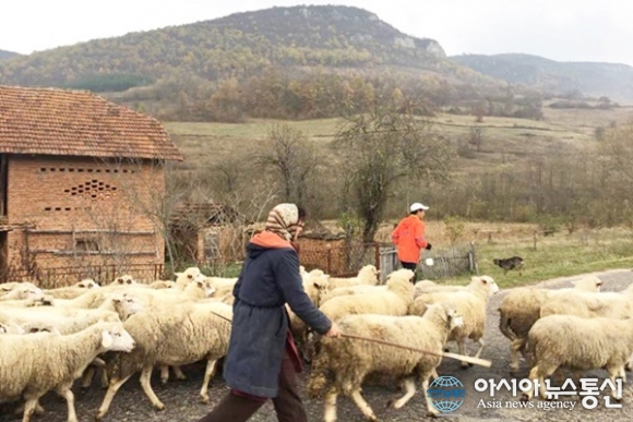 | 세르비아 페리슈서 피로트로 가는 길에 여자 목동이 모는 양떼를 만나 같이 뛰고 있다.(사진=김나라) |