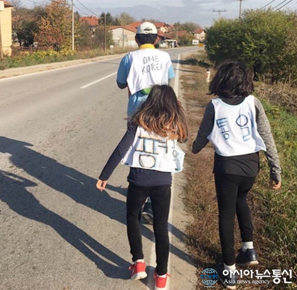 | 불가리아에서 응원하러 온 통일흥부가족 가진이와 어진이가 마라톤에 동행하고 있다.(사진=김나라) |