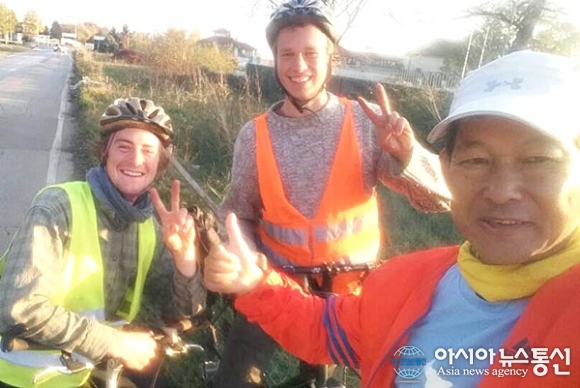 | 자전거를 타고 지나가던 독일 청년 둘이 나에게 말을 걸어와 사진을 같이 찍었다.(사진=강명구) |