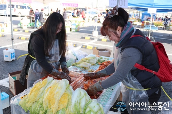 | 11일 세종시 도담동 로컬푸드 매장에서 '김장담그기 한마당' 축제가 열렸다. 이날 행사에는 800명의 가족이 참가해 대 성황을 이뤘다. 지난해에 이어 창원에서 김장을 하기위해 남동생집을 찾은 박지숙씨가 딸과 함께 김치를 담고 있다./아시아뉴스통신=홍근진 기자 |